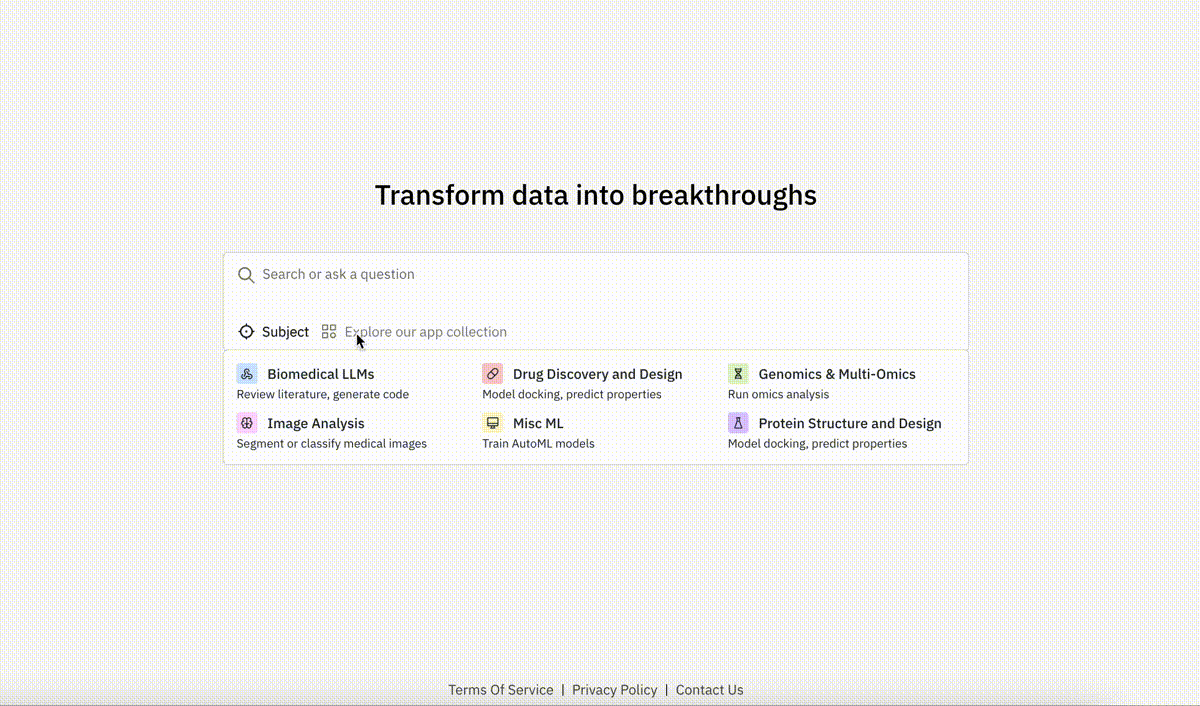 With 650+ life sciences models at your fingertips, finding the perfect AI tool can sometimes feel like searching for a needle in a haystack. That’s why we reimagined our platform to make discovery effortless. Our apps are now grouped into six easy-to-explore categories, rapidly searchable with semantic queries: